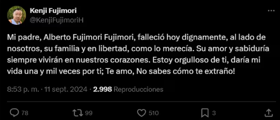 “Mi padre, Alberto Fujimori Fujimori, falleció hoy dignamente, al lado de nosotros, su familia y en libertad, como lo merecía. Su amor y sabiduría siempre vivirán en nuestros corazones. Estoy orgulloso de ti, daría mi vida una y mil veces por ti; ¡Te amo, no sabes cómo te extraño!”, escribió Kenji Fujimori.